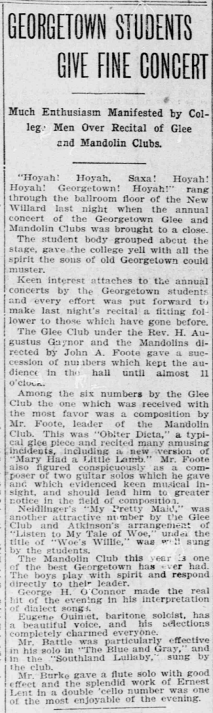 Mostly forgotten today, glee and mandolin clubs were all the rage in the pre-jazz era. There was an exhibition on music at Georgetown several years ago that described the craze as follows: