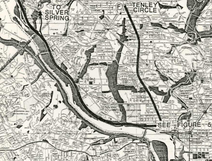 The Cabin John right of way is still owned by the city and may see a future as a bike/pedestrian path. The B & O railroad line became the Capital Crescent Trail after the report was issued.