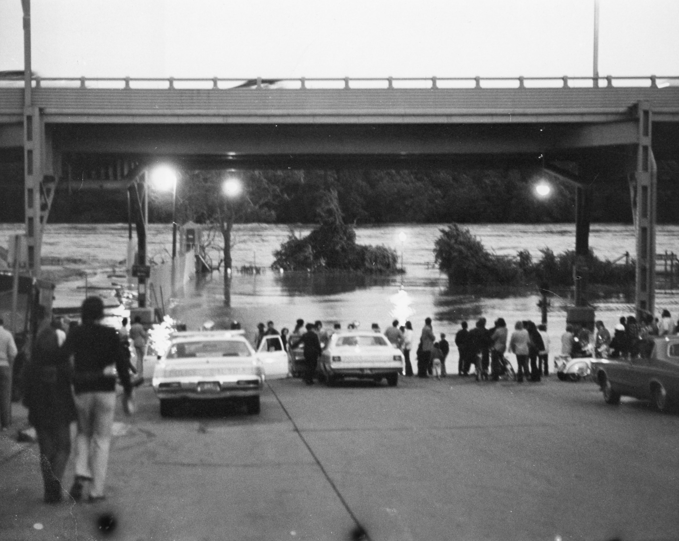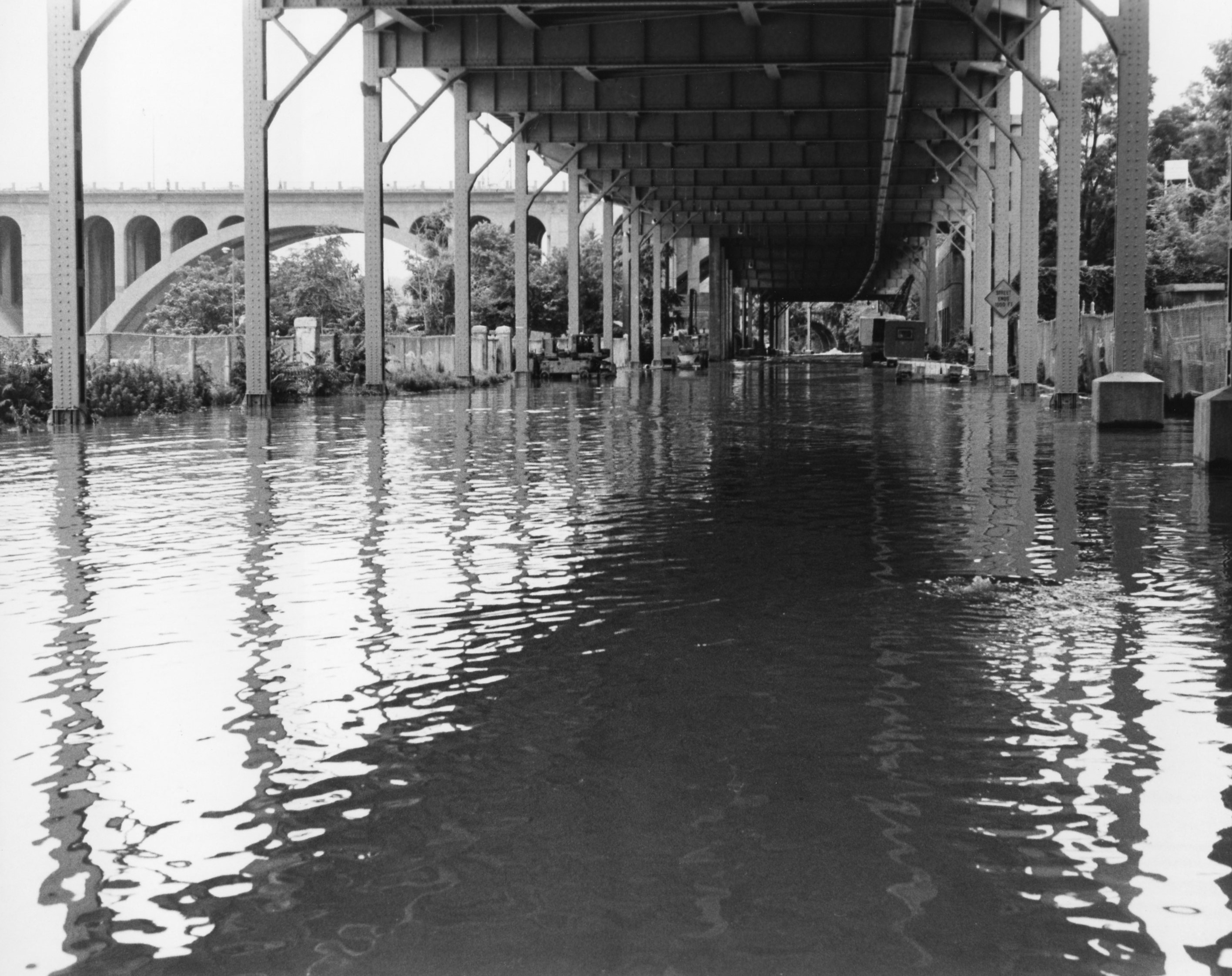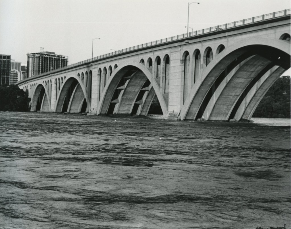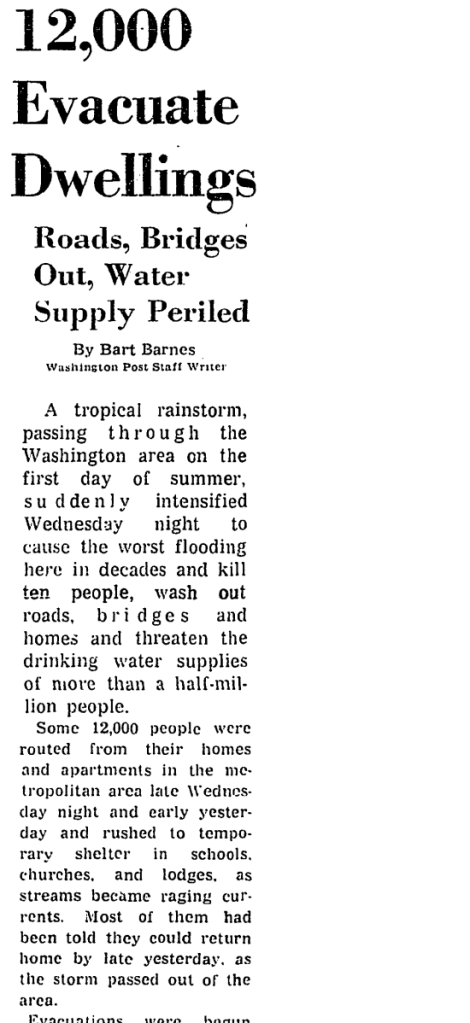 The most dramatic photo of Agnes’ effect in DC that I recall appeared as the front page of the old Washington Daily News, an afternoon tabloid. The whole page below the masthead was a photo of Rock Creek in full flood taken looking north from the “M” Street Bridge. The entire valley, which is narrow at that point, was submerged. Lamp posts and traffic signs marked the Rock Creek Parkway right of way.