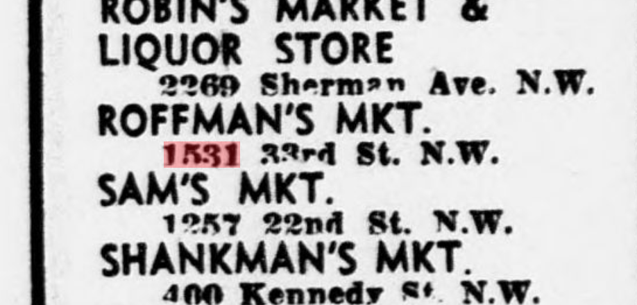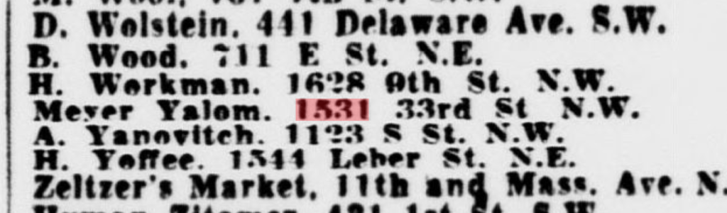 So it’s possible the grocery store existed even earlier. In either event, the store was owned by a succession of shop keepers. Like many grocery stores around DC, the proprietors were often Jewish. For instance, for a while the grocery store appears to have been owned by Jacob Bass, who was prominent in the Washington Jewish society, having once served as president of the Adas Israel synagogue.