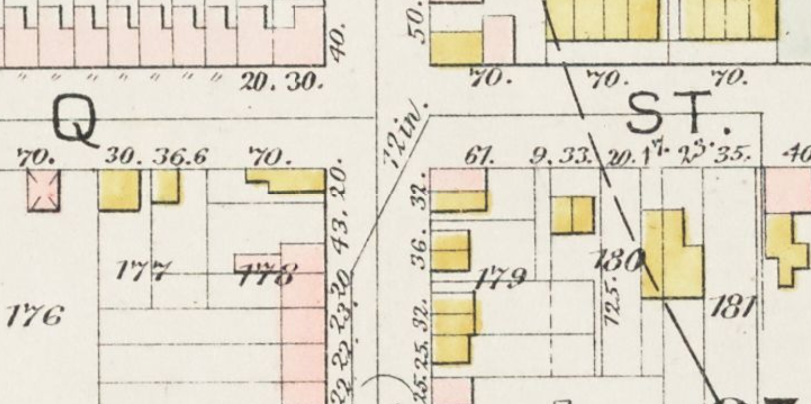 Building records indicate that the structure itself was only built in 1893, however a structure previously occupied the lot, as seen in this 1887 survey:
