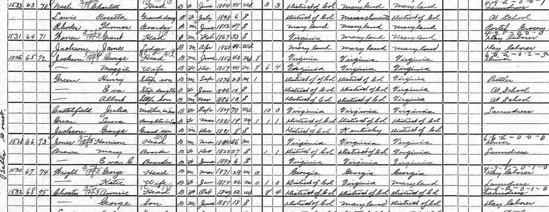 Despite the homes being so small (approximately 600 square feet each), they were originally split into two, with each floor hosting a different family. At the time of the 1900 Census, the enumerator counted twenty-seven people living in the seven homes he surveyed (GM’s not sure why three of the homes weren’t counted). All of them were black: