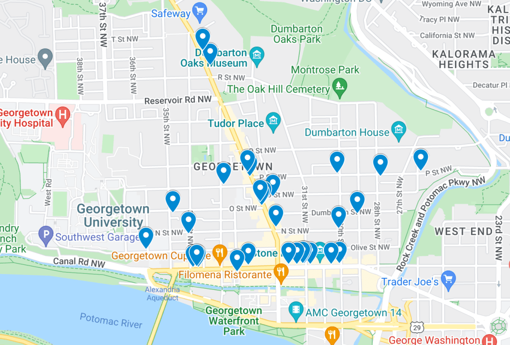 The map above shows the Georgetown locations of various chain grocery stores in the 1930s and 1940s. (Here is a link to the map). The vast majority of them were Sanitary grocery stores. (This was a chain started in Bethesda by John Letts in 1909. By 1927, Letts bought Piggly Wiggly and had 362 locations. The next year Safeway bought out Sanitary.) Beyond the Sanitary grocery stores, there were a handful of A&Ps and Piggly Wigglys.