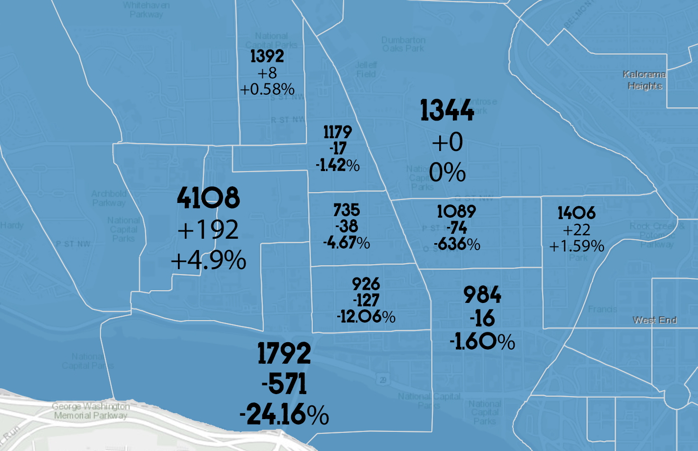 Most notably, the lower west part of Georgetown lost 571 people, over a quarter of the population. The next block group up (basically M up to O St. between Wisconsin and 35th) lost 127, over 12%. Conversely, Georgetown University gained 192, almost 5%.