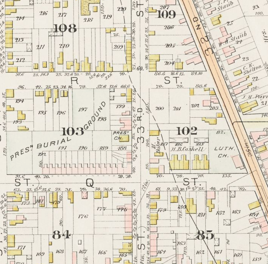 (32nd and R in 1890 is not 32nd and R today. At this point what is now Wisconsin Ave. was called 32nd St. and what is now Q St. was called R St. Here’s a map of the area in 1887: