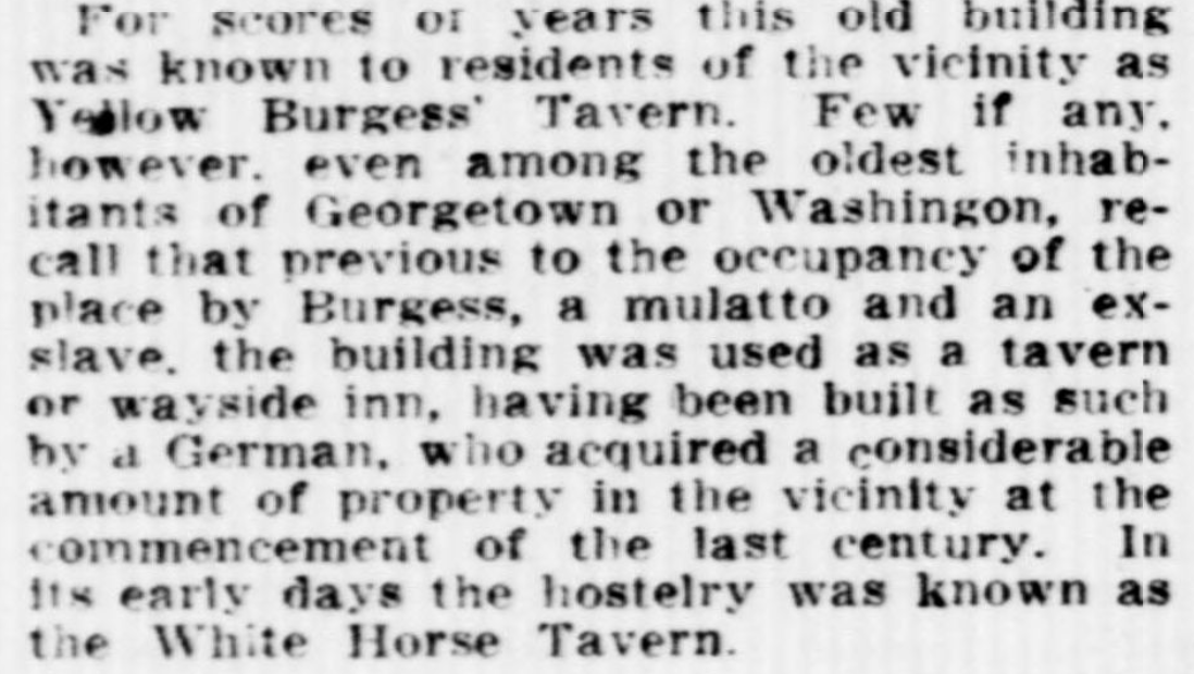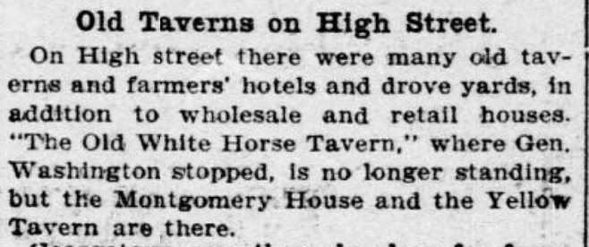 What you should take away from this is that these names exist more in legend that in history. This is not an uncommon phenomenon in Georgetown. A lot of mistakes about Georgetown’s past were made in the spirit of creating an “Old Georgetown” myth. For instance, for a long time people thought the Old Stone House was where George Washington’s headquarters were. It wasn’t. It’s just an old stone house that somehow escaped getting torn down. Other claims on Georgetown’s early history have been mistakenly made, like how the George Town Club used to claim it was once the legendary Suter’s Tavern. It would appear that the Yellow Tavern and the White Horse Inn/Tavern are merely less prominent examples. (Although it’s not even clear to GM that there ever was a White Horse Tavern/Inn in Georgetown. It was the name of a popular play at the turn of the century and may have influenced people’s “memories”.)