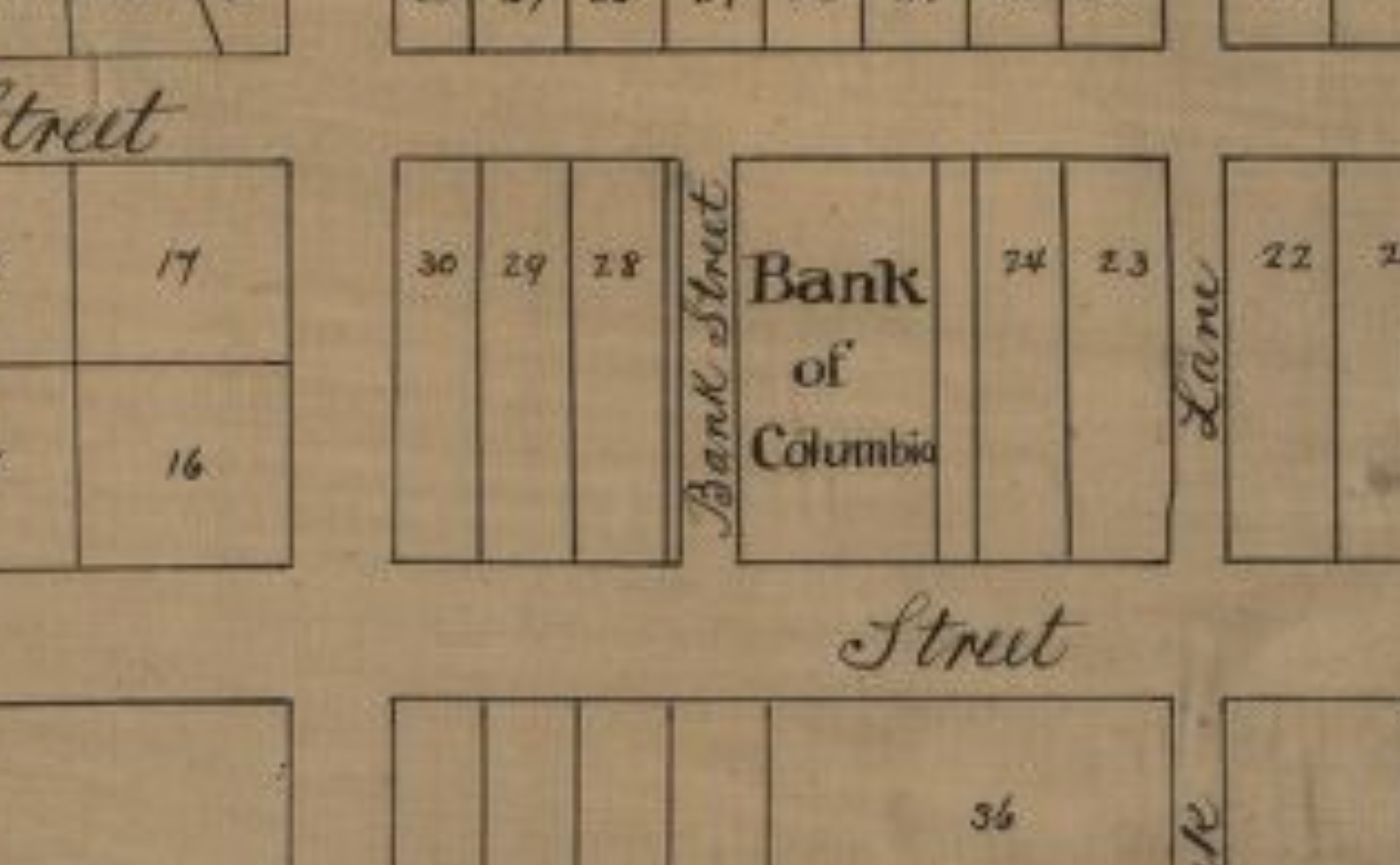 But some streets didn’t fit in with the DC system and were left as is. These include Dumbarton, Olive, Prospect, etc. On this list included Bank St. (GM will get to the street versus alley question below).