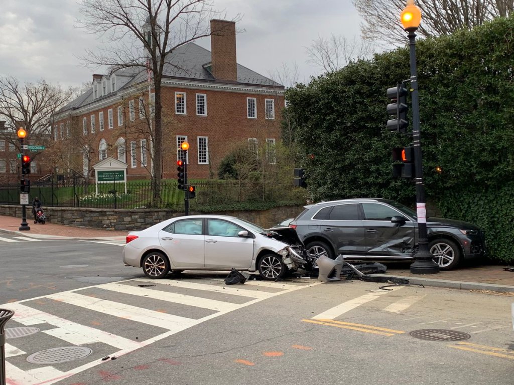 This crash occurred yesterday morning at the intersection of Wisconsin Ave. and R St. It’s unclear to GM what specifically occurred but it appears the driver of the light gray car smashed it into the dark gray BMW. The collision had enough force and momentum to send the BMW careening onto the sidewalk.