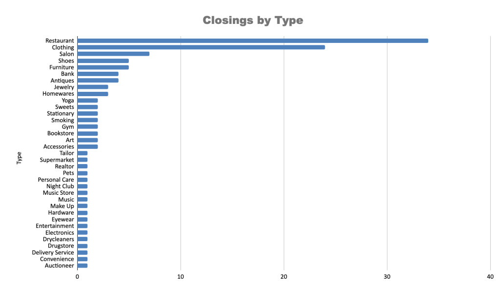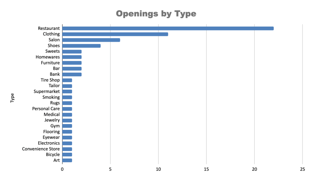 As you can see, by far the largest category of openings was in restaurants, where there were 22. Clothing stores came in a distant second at 11, and salons trailing at 6. The rest were scattered across a bunch of different categories.