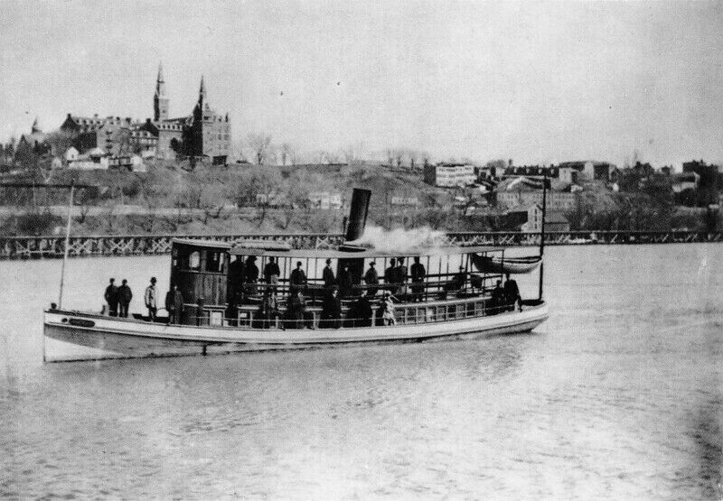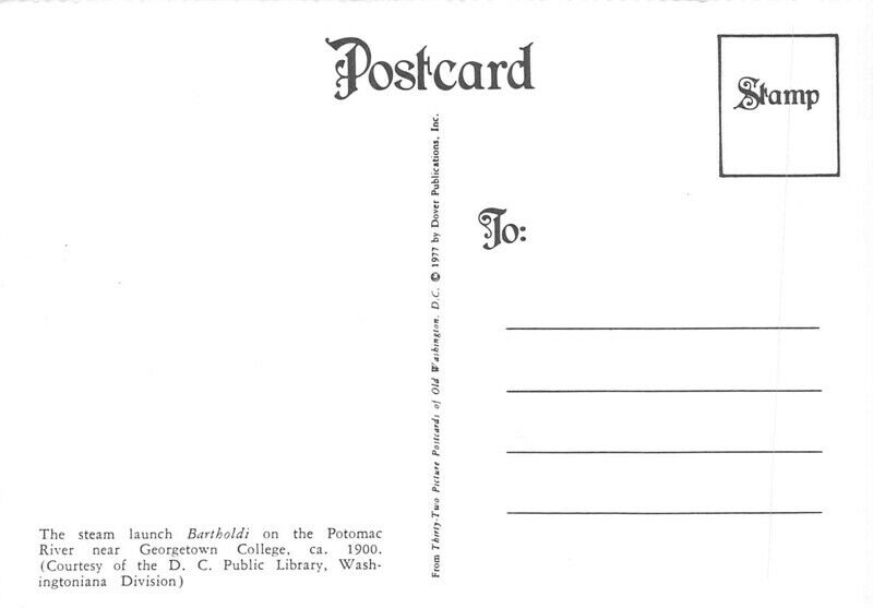 The small notes indicate that the card is actually only from 1977. The credits say: “The steam launch Bartholdi on the Potomac River near Georgetown College, ca. 1900. (Courtesy of the D.C. Public Library, Washingtonia Division)”