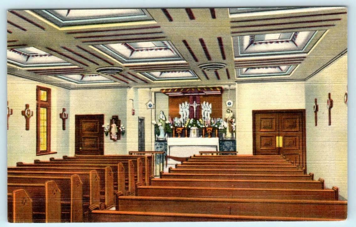 The card, which according to the listing comes from the 1940s, says on the back that the chapel is dedicated to the immaculate heart of Mary: