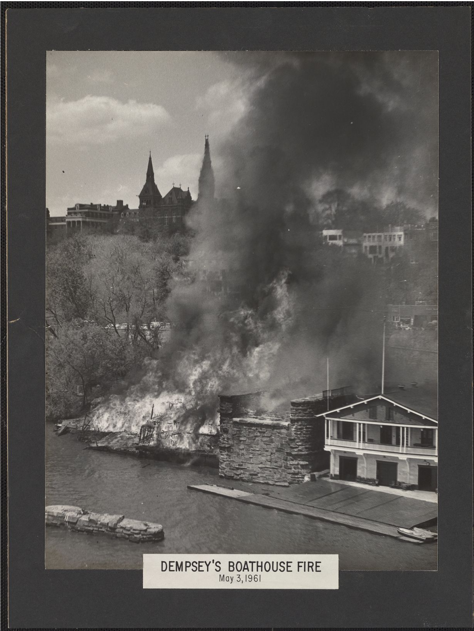 This fire took place May 3, 1961 and destroyed the historic Dempsey’s Boathouse that once stood just upriver from the old Aqueduct Bridge abutment.