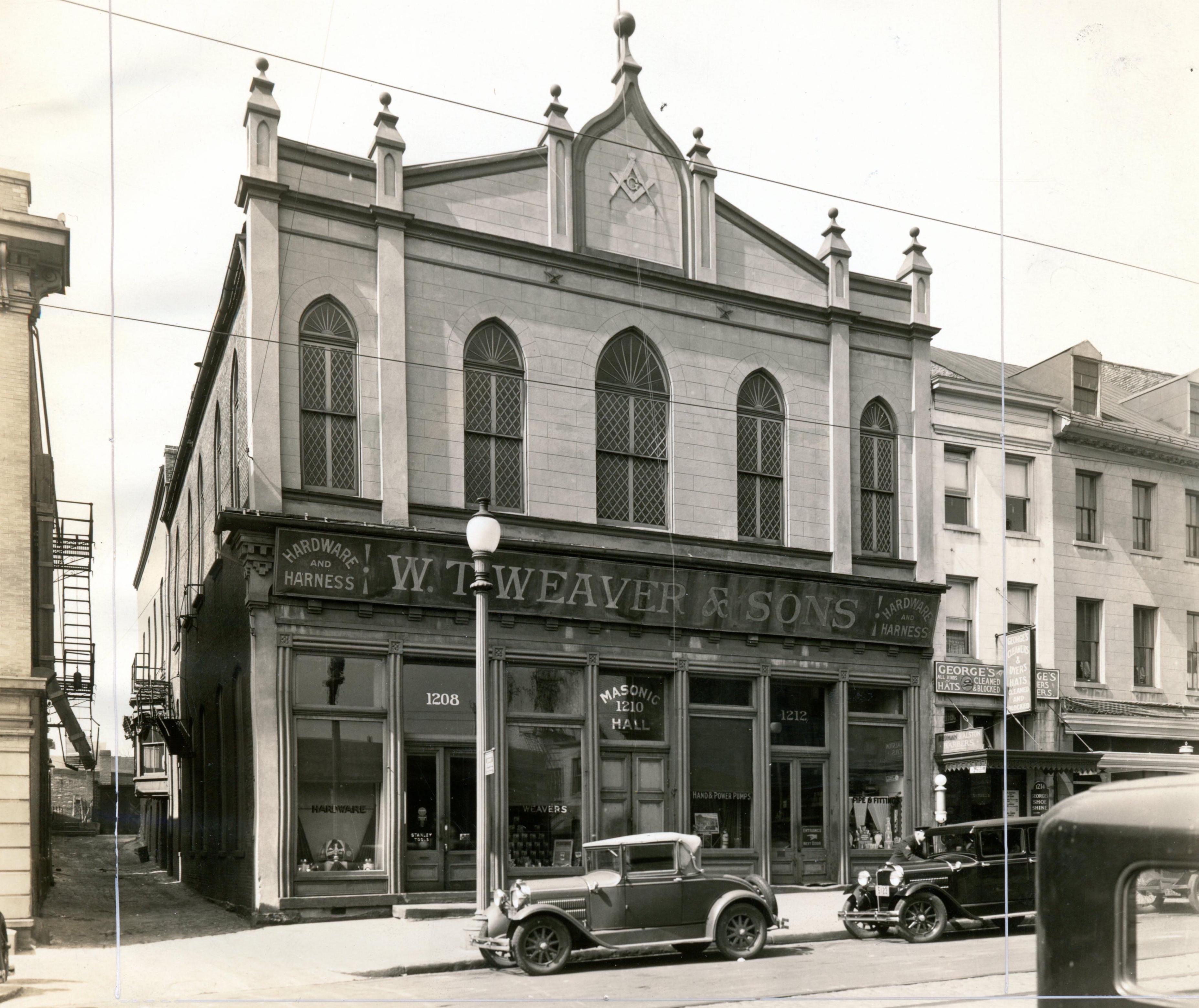 In 1963, a fire hit the historic Masonic Hall that stood on Wisconsin Ave. just above M St. Like all masonic halls, the brotherhood’s meeting rooms were on the second floor. The first floor housed Weaver’s hardware. Here’s what the old building looked like: