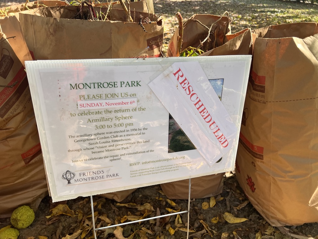 This Sunday, the historic armillary sphere has returned to Montrose Park. workers installed the marker this week. And the Friends of Montrose Park will mark the occasion this Sunday in the park’s Rose Garden from 3:00 to 5:00 pm.