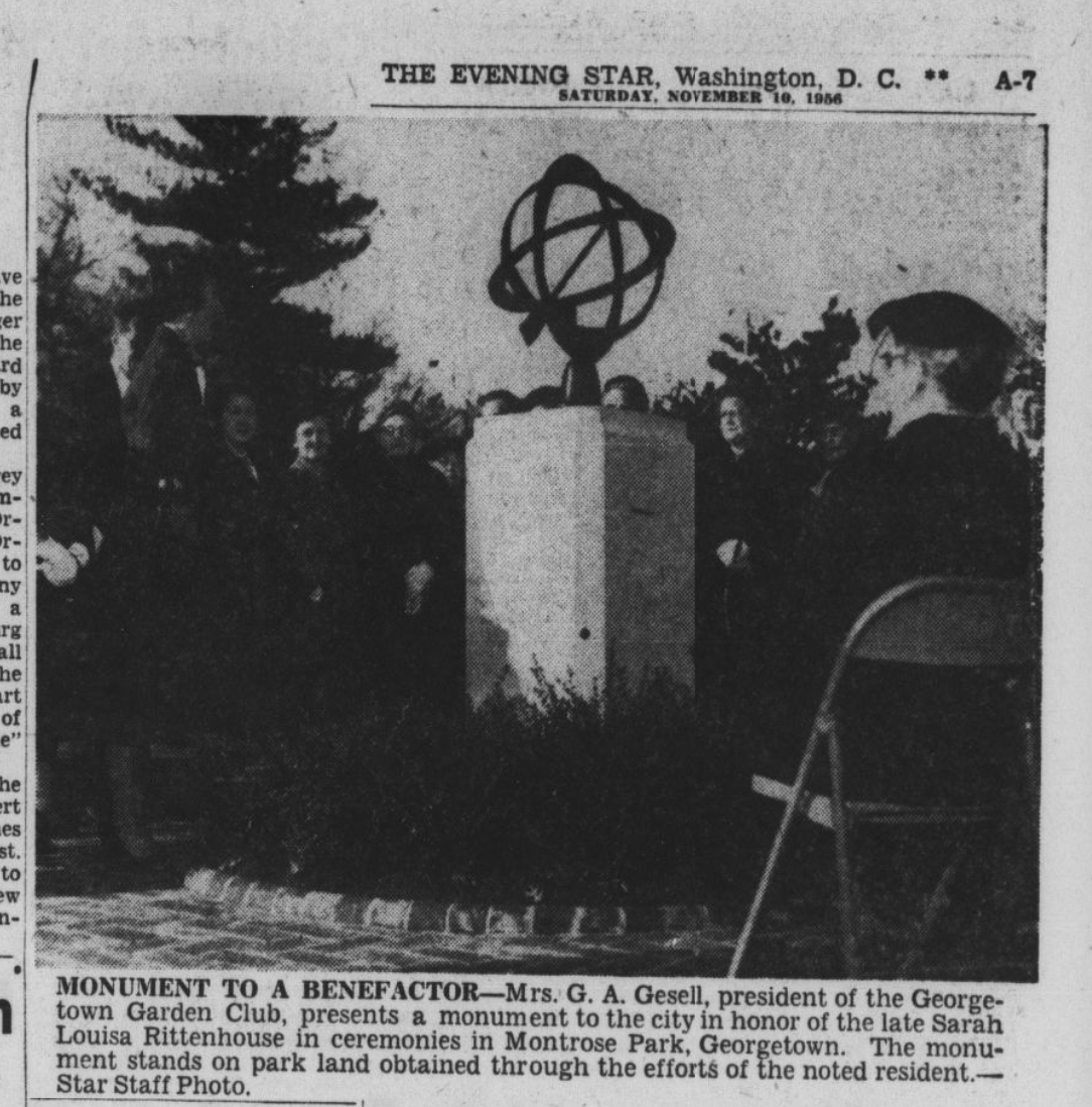 The sphere was originally placed in the park to honor Sarah Louisa Rittenhouse by the Georgetown Garden Club in 1956. Rittenhouse was largely responsibly for convincing Congress to purchase the grounds of the former Montrose estate for a public park in 1911.