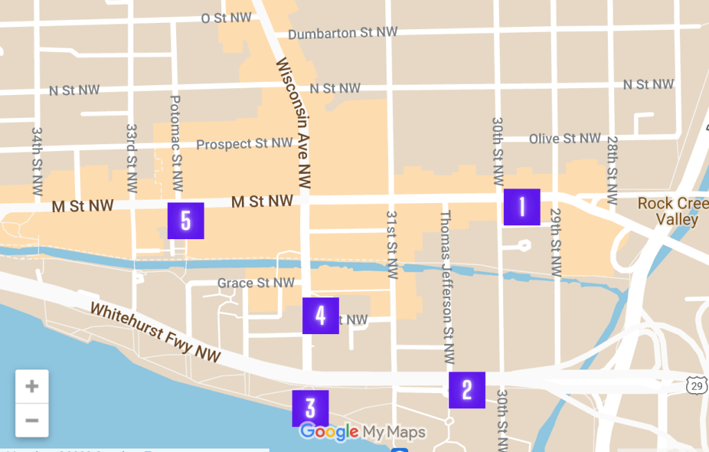 Georgetown GLOW has returned once again, as you may have already seen. The light exhibits will be on display until January 22nd. This year the sculptures are grouped in the southern part of the neighborhood, as you can see in this map: