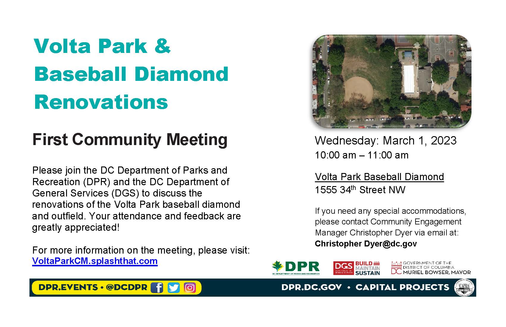 Primarily through the efforts of the Friends of Volta Park, the city has dedicated $700,000 to restore and renovate the park’s baseball diamond and grass field. And DPR and DGS are finally moving forward with the design and implementation of that project. As part of that, the project reps will be holding a community meeting in the park this Wednesday morning from 10-11. As the ANC commissioner covering the park, I will of course be there. So will leadership from the Friends of Volta Park. But if you are also interested in attending, please show up! It’s important that we make the most of this opportunity to improve the park and your input is critical to that end! So see you there!