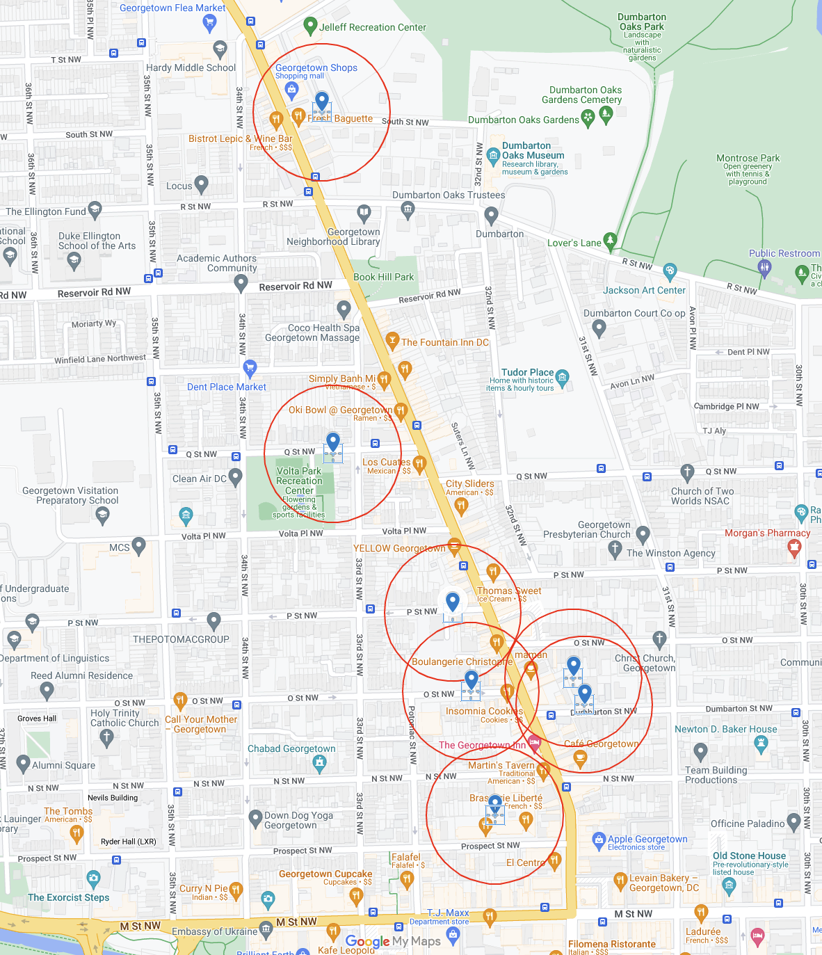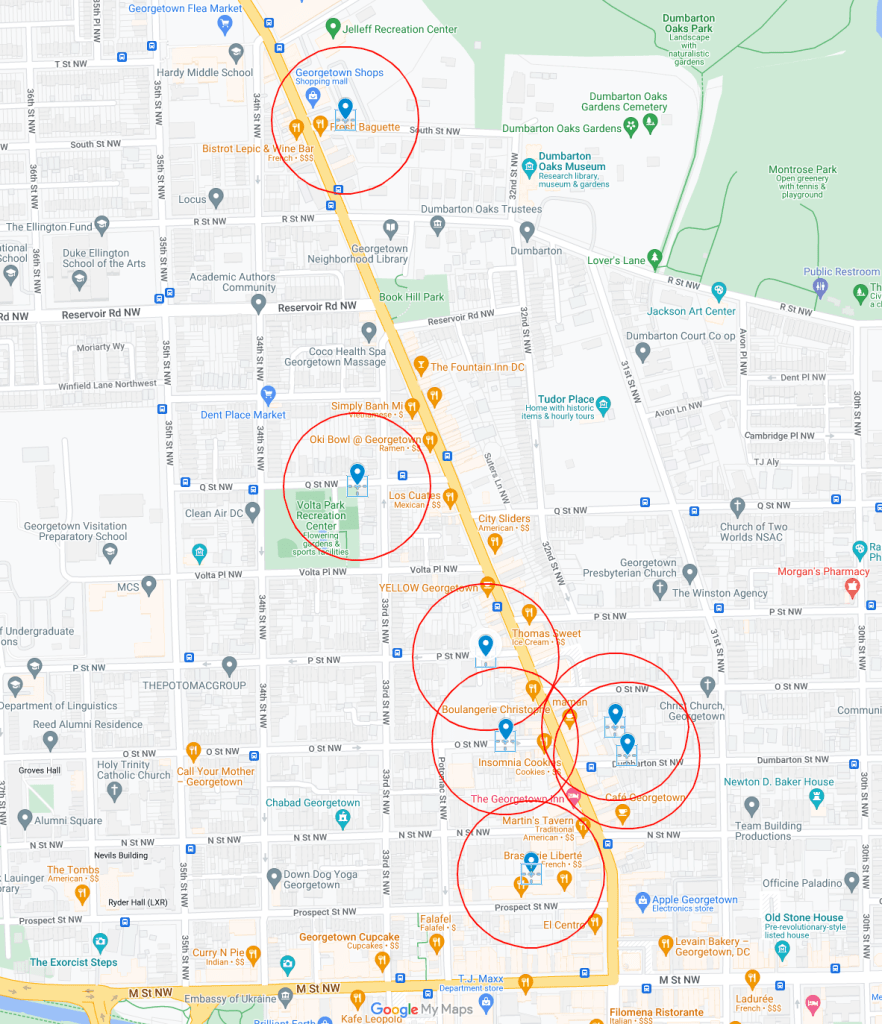 So taking that rule, I generated a simple map for Georgetown, drawing circles with radiuses of 300 feet at the corners of the qualifying schools and rec centers in Georgetown. Thus any lot in the map that is even partially in the red circles above cannot host a post shop. (You can mentally slide the circles around the school lots to see what other lots they reach, but generally I drew them to show the greatest coverage)