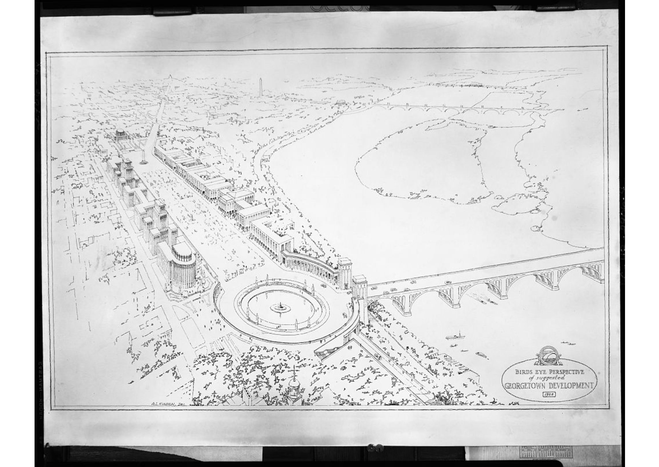 The caption for the drawing suggests that it was circa 1925. That’s just two years after Key Bridge was built, and several decades before any of the crazy highway plans emerged. If anything, this proposal was straight out of the City Beautiful movement that reshaped much of central DC in the early 20th century.