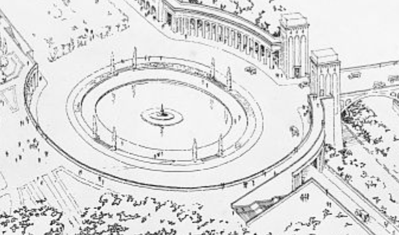 Besides being way over the top and dreadfully destructive of the existing neighborhood, the plans don’t make a lot of geological sense. Look at where Key Bridge enters that pantheon. It’s remains at grade all the way up to what was once N St. But that is not what the existing landscape looks like, at all. They’d have to excavate the cliffs around the Car Barn all the way past the old Georgetown Hospital. And ultimately the drop from N St. down to the circle would have been a lot steeper than the drawings suggest. They be at least as steep as the drop from the top of the Carn Barn to M St., and probably a bit more than that.