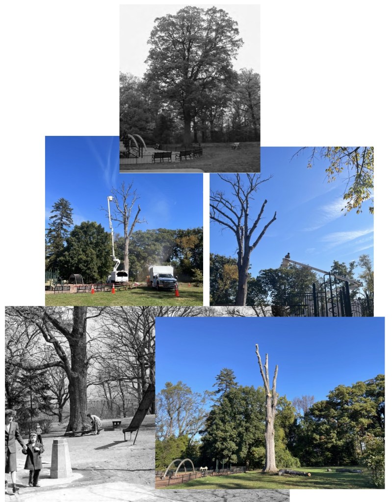 The Friends of Montrose Park reported that the historic white oak that stood next to the playground was taken down. Visitors to the park could see for a while now that the tree was struggling. The Friends stated that it was ill with “Hypoxylon, a fungal disease that rapidly affects oaks when they are already under stress from other factors including drought and root injury.”