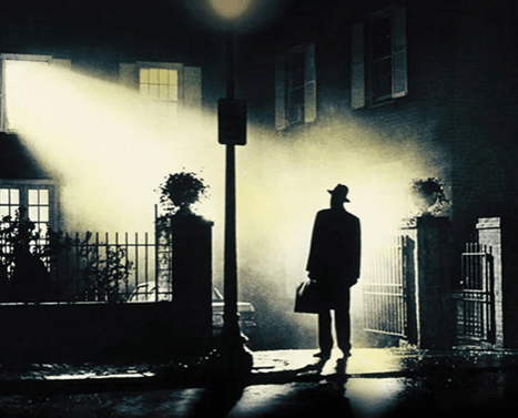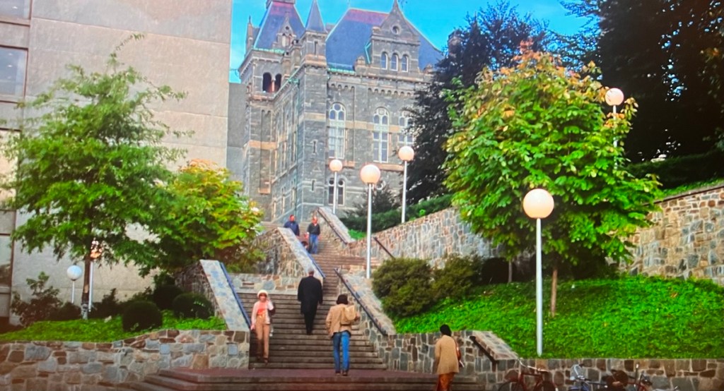 I loved this little scene as well. It shows Ellen Burstyn’s character eavesdropping on a conversation between Father Karras and another priest. The previous shots establish that this is supposed to happen on or immediately next to the campus. But Georgetown residents will immediately recognize this as actually being Christ Church in the east village. It’s amusing that they went so far to make this Episcopal Church look Catholic by announcing the confessional schedule on the board. (While Episcopalians do perform confessions, it’s not something you’d see regularly scheduled on a sign like that. Although maybe it would be more likely back then.)