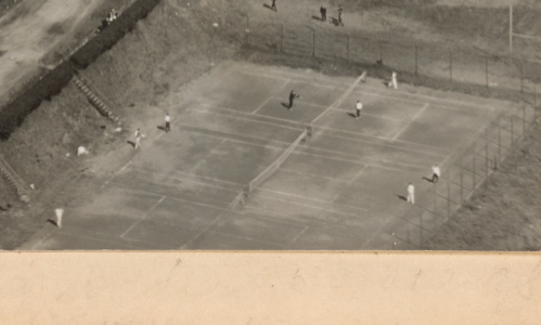 Speaking of sports, after leaving the track, Father Karras walks by the former tennis courts that once stood west of Lauinger Library. I looked into these courts a while back. Here they are in the 1920’s: