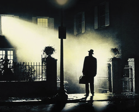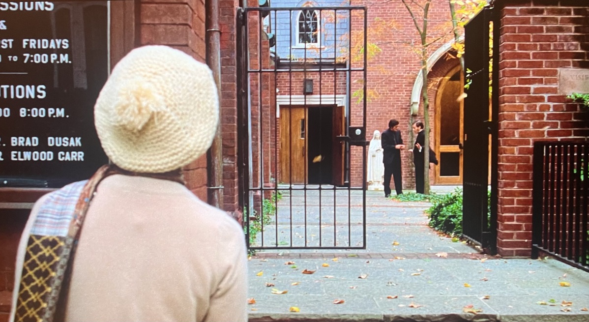 I loved this little scene as well. It shows Ellen Burstyn’s character eavesdropping on a conversation between Father Karras and another priest. The previous shots establish that this is supposed to happen on or immediately next to the campus. But Georgetown residents will immediately recognize this as actually being Christ Church in the east village. It’s amusing that they went so far to make this Episcopal Church look Catholic by announcing the confessional schedule on the board. (While Episcopalians do perform confessions, it’s not something you’d see regularly scheduled on a sign like that. Although maybe it would be more likely back then.)