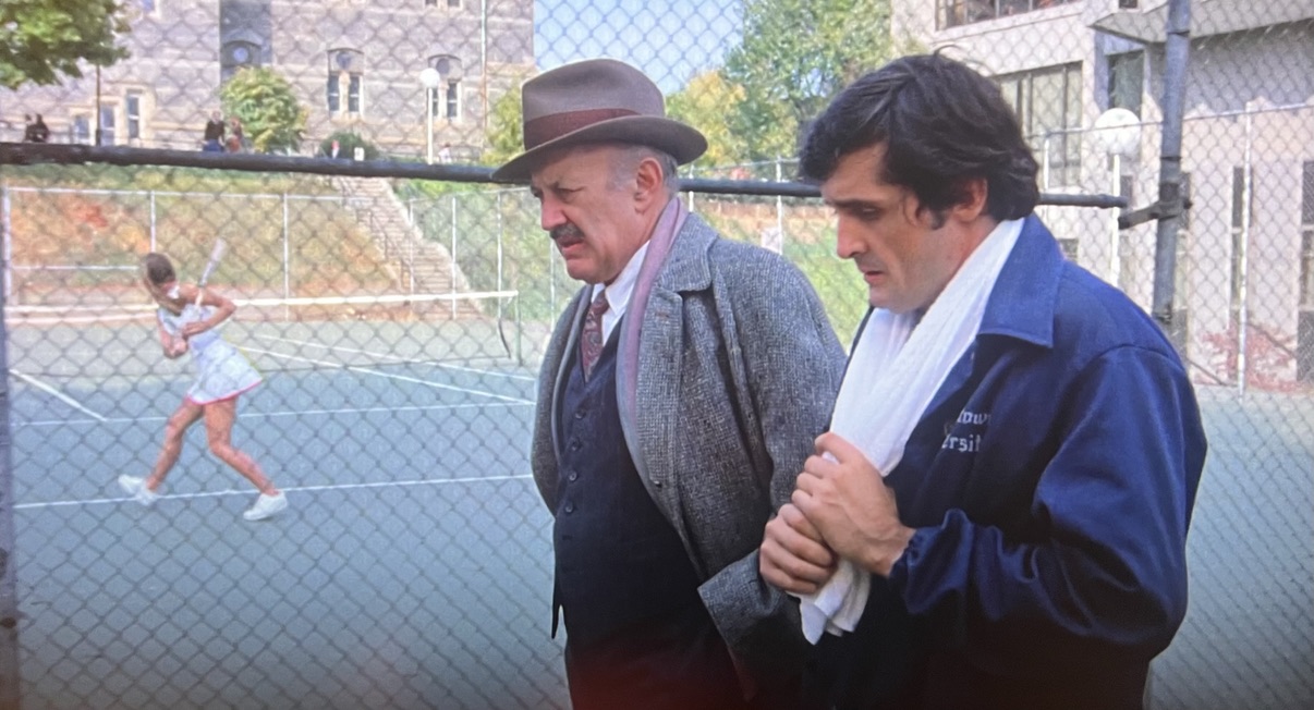 Speaking of sports, after leaving the track, Father Karras walks by the former tennis courts that once stood west of Lauinger Library. I looked into these courts a while back. Here they are in the 1920’s: