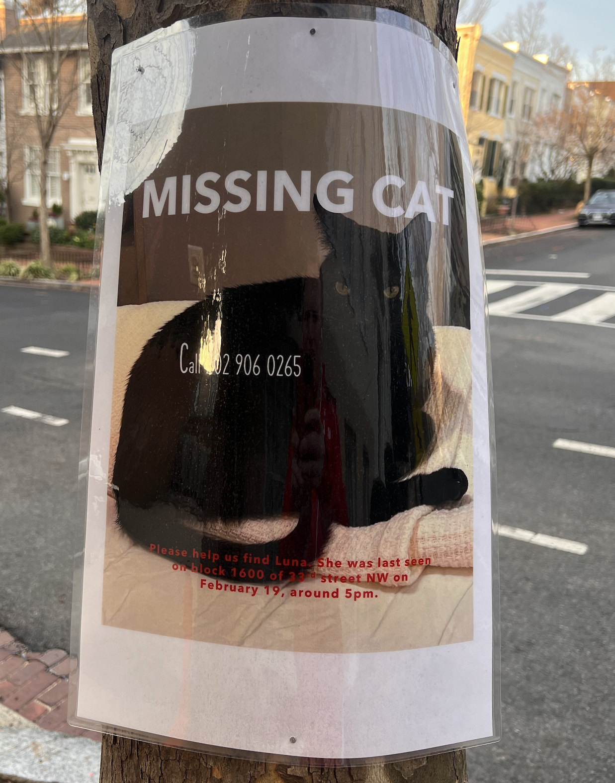 Please keep an eye out for a lost cat! The cat, named Luna, disappeared from around 33rd and Dent on February 19th around 5 pm. She is a beautiful all black cat. If you see her contact her owner at 202-906-0265.