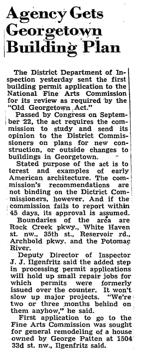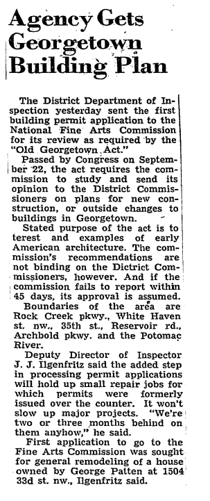 The permit was applied for within weeks of the adoption of the Old Georgetown Act on September 22, 1950. The review was performed by the Commission of Fine Arts, which is the actual body that is authorized under the act to comment on permits. The Old Georgetown Board was created later in order to take primary responsibility for Georgetown (although the CFA retains the discretion to overrule the OGB).