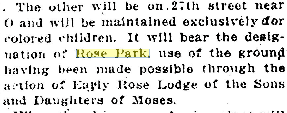 The Sons and Daughters of Moses was part of an African American fraternal society founded in 1868. This particular lodge was known as the Early Rose Lodge, Number 67 (or alternatively the Early Rose Tabernacle) and was founded about 1886. This was decades before the creation of the park, so it is reasonable to conclude that the name did not derive from the park itself.