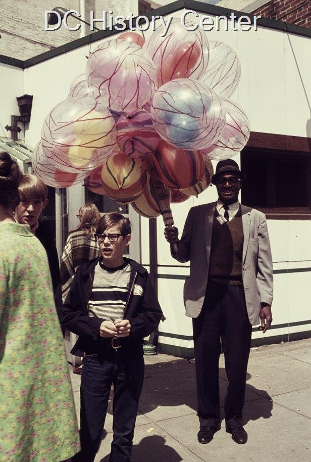 He looks to be peddling his balloons at the corner of Wisconsin and N St. The Little Tavern burger shop (which, many tenants later, is Dig) sits behind him.