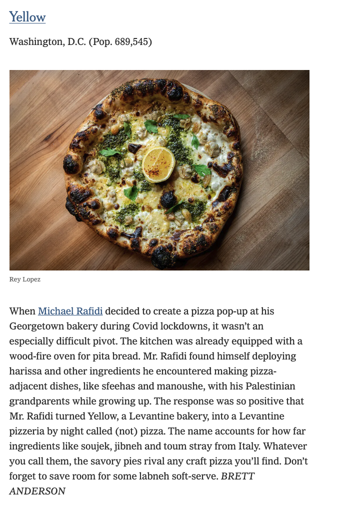 The New York Times just included Georgetown’s Yellow among its list of just “22 of the Best Pizzas in America Right Now“. Here’s what they had to say about the unusual pizza on offer there: