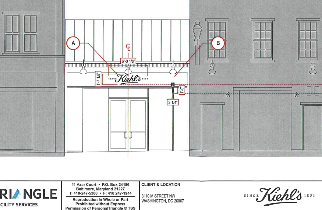 Two new retailers are coming to Georgetown, according to new Old Georgetown Board filings. The first, seen above, is for Kiehl’s. They are apparently moving into 3110 M St., which was most recently an Up/West.