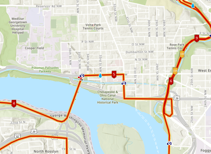 Specifically, from about 5:30 AM until about 10:30 AM, Key Bridge, M St. west of Wisconsin, Wisconsin south of M St., and K St. east of Wisconsin will be closed to auto traffic. (Pedestrians can still cross throughout the closures). Rock Creek will also be closed (and for a bit longer than the Georgetown streets).