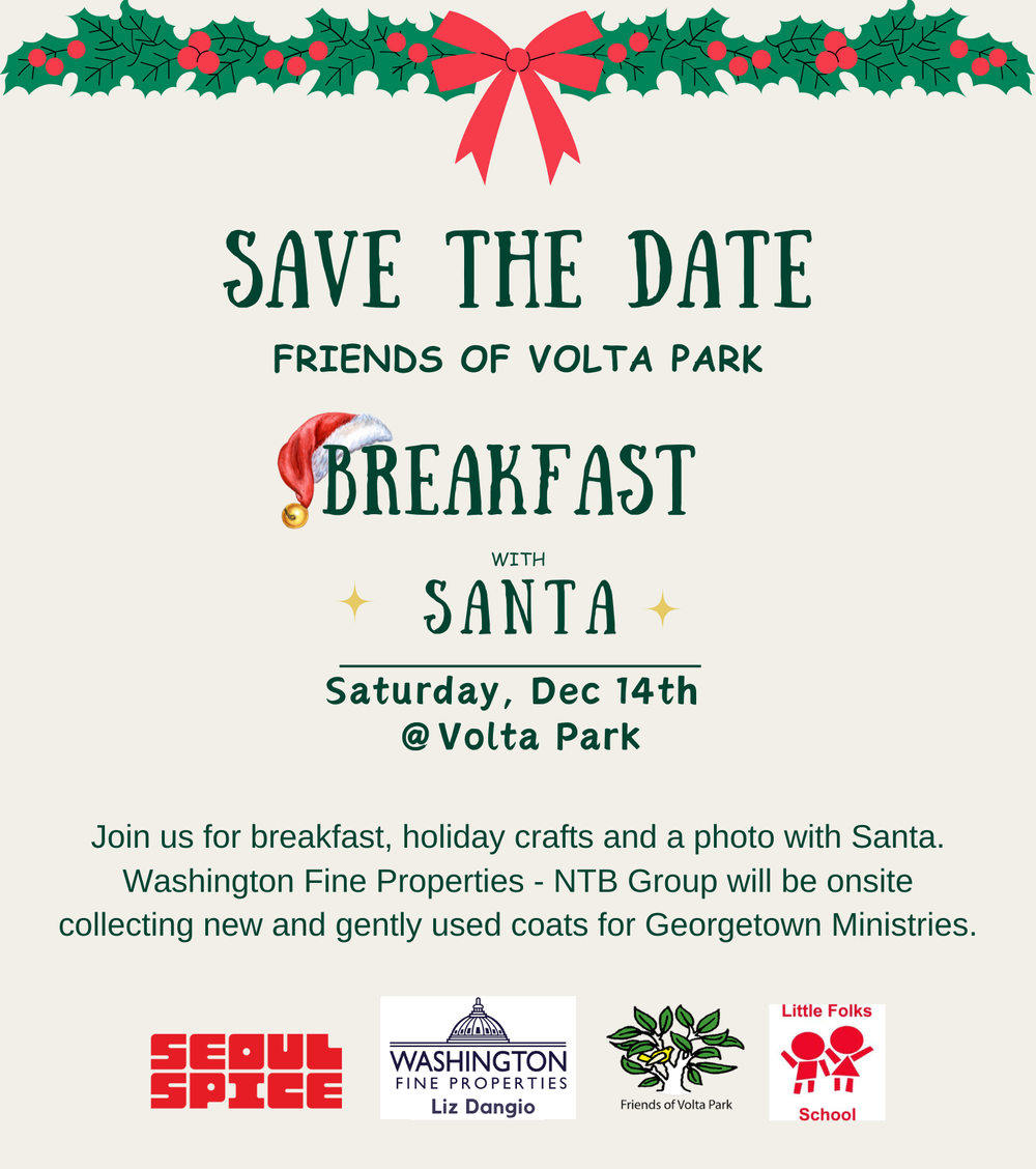 The annual Volta Park Breakfast With Santa returns this Saturday at the park playground from 10am to 12pm. Enjoy donuts and coffee with your neighbors and get your photo with Santa ($15). All proceeds go to Friends of Volta Park to help keep the park in beautiful shape!