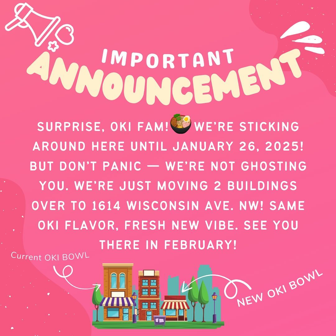Oki Bowl is moving up to 1614 Wisconsin Ave. This spot hosted another popular cheap-ish dining spot: Jaco Taco. Sadly the taco/juice bar closed last year. It’s unclear to me exactly how Oki Bowl will take over the space. The square footage is much less than Oki Bowl’s old spot. Perhaps they will occupy the upstairs or the adjoining retail space, which has been an illegal pot shop for a while.