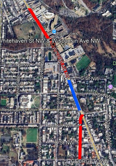 In December I discussed how contractors for AT&T were ripping up 33rd St. to build a new trench, despite the fact that the street was repaved just one year before. I’ve since confirmed what I suspected, that this was part of a massive project across the city. Here is a partial map of the course it is taking through Georgetown: