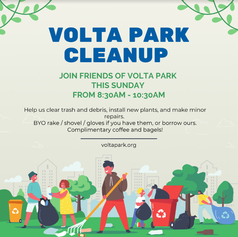 There will be a park clean up at Volta Park this Sunday at 8:30. I’ll be there so if you’re itching to give me a piece of your mind, come and join me in picking up trash as you fill me in! There will be a Tunes for Tots session from 10-10:45 following the clean up.
