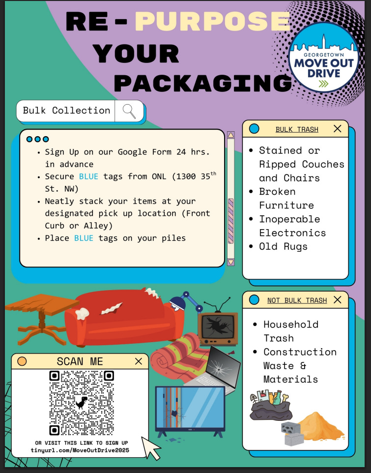 Spring cleaning also often includes wanting to get rid of bulk items, like couches and other furniture. You can schedule that pick up through 311, but you have a better option this time of year. As part of the wonderfully successful Georgetown Community Partnership, the university offers its students free bulk trash pick up. This helps avoid situations of students leaving town with trash and other items sitting on the sidewalk. The good news is that non-student residents can take advantage of the same service!