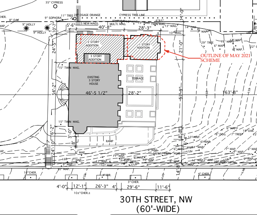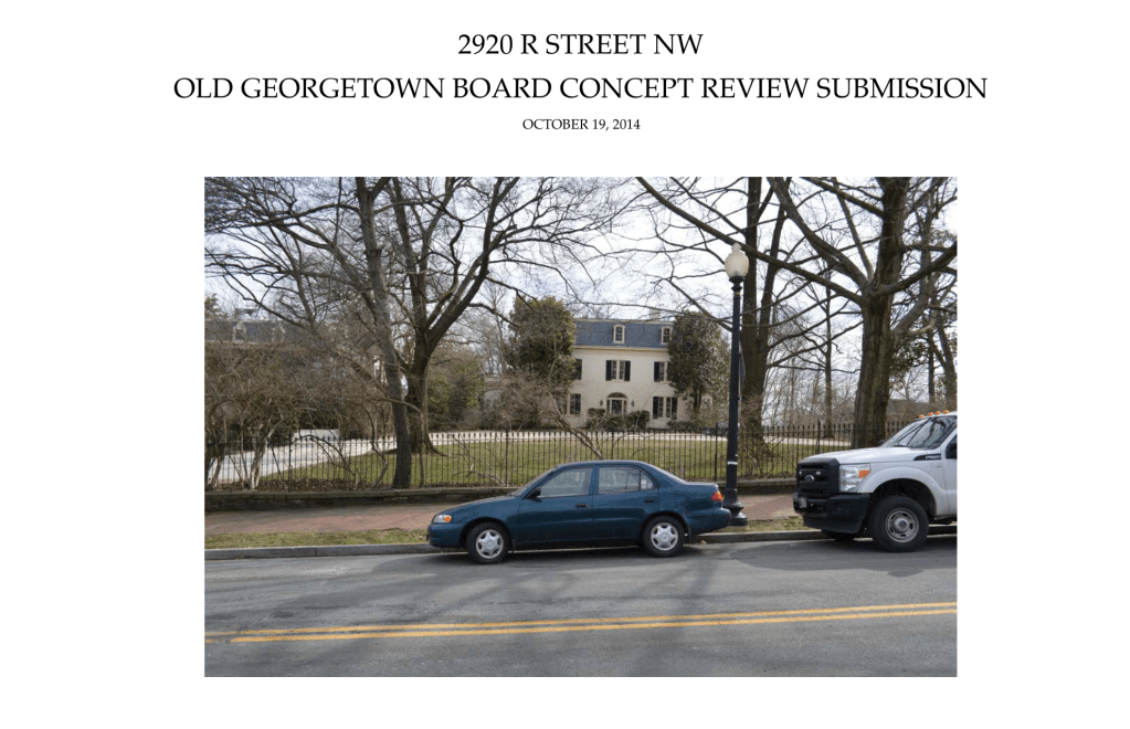 One more OGB filing far from the commercial corridors may raise some eyebrows. The application relates to 2920 R St., the Beall-Washington house, or more popularly known at the Katharine Graham house. It has been owned for over 20 years by Mark Ein, but it has remained vacant and in increasingly poor shape over that time. Ein has previously proposed to make renovations of the house, which were objected to by the immediate neighbors. You can read about the testy affair here.