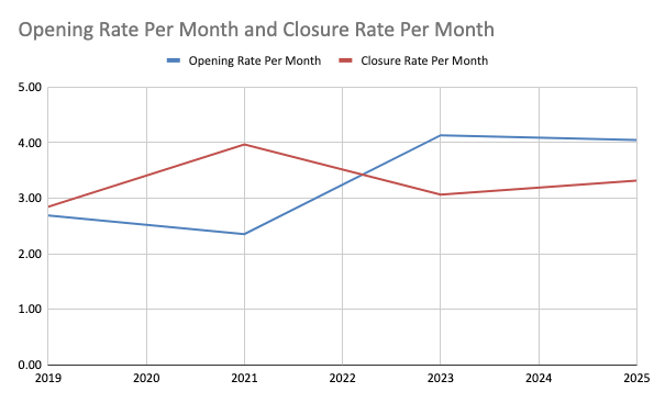 The opening rate per month (the blue line) jumped from about 2.25 coming out of Covid to over 4 in 2023. It’s stayed roughly there. The closure rate per month (the red line) obviously jumped due to Covid but has settled to a little above 3 per month. In other words, since 2021 there are an average of four stores opening in Georgetown a month with three stores closing. That’s a healthy positive surplus.