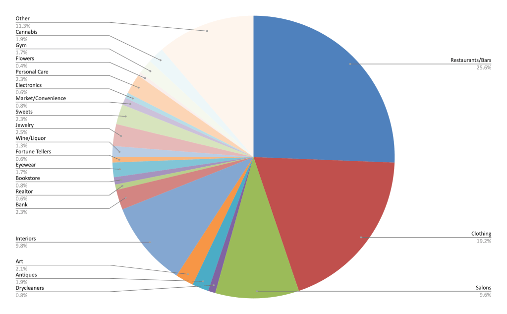 Here’s my most recent chart showing the breakdown of categories of all the stores and businesses in Georgetown: