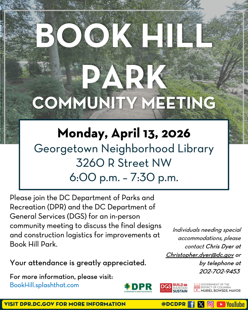 The Department of Parks and Recs will be holding a final public meeting for the proposed renovations to Book Hill Park. The meeting will take place at the Georgetown Library at 6 pm on April 13th. The city reps will be presenting the final designs and construction logistics. Come on out and learn what’s in store for the park!