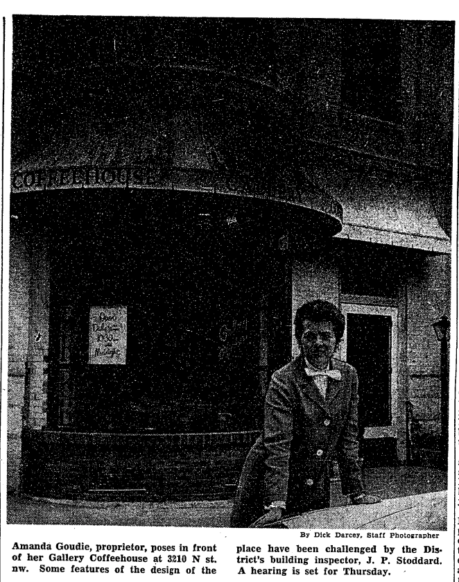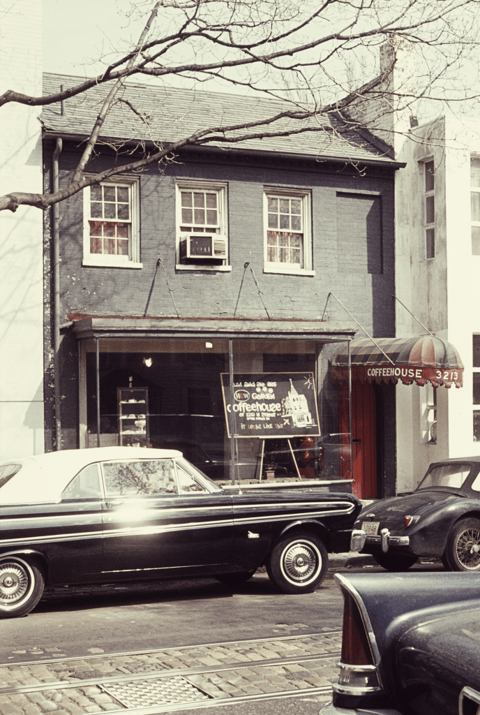 But lets start with the seemingly innocuous photo. It comes from the DC Historical society. It’s from the Emil Press collection and was taken around March of 1964. It shows 3213 O St. which at the time was a former coffeehouse named Gallery. It operated here (with “red jacket waiters sedately serving cappuccino and darjeeling” according to the Washington Post) for seven years.