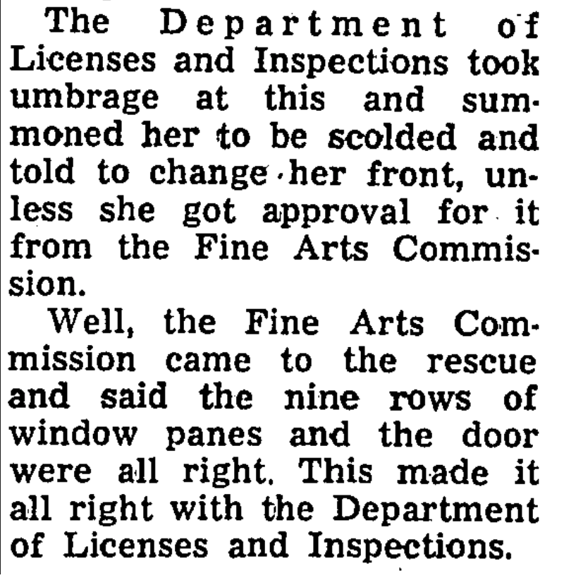 Apparently she needed to do some work on the new location, including fixing the door. According to the article, the plans she got approved by the CFA included one design for the door, but she installed a different one. This lead to a summons from the DC government. She was nonplussed:
