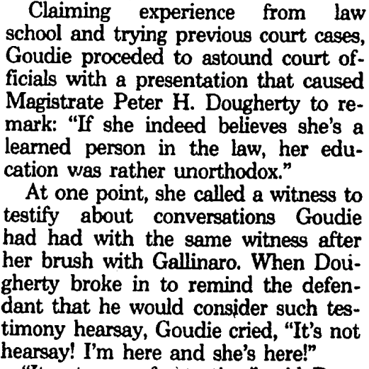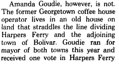 I’m not sure when the shop closed, but Ms. Goudie eventually made her way to Harpers Ferry, WV where she opened another coffeehouse. She also appears to have become a bit of a local gadfly. After a violent run in with the police chief in which she apparently bit him, she stood trial and acted as her own lawyer. It was, as it always is, a mistake: