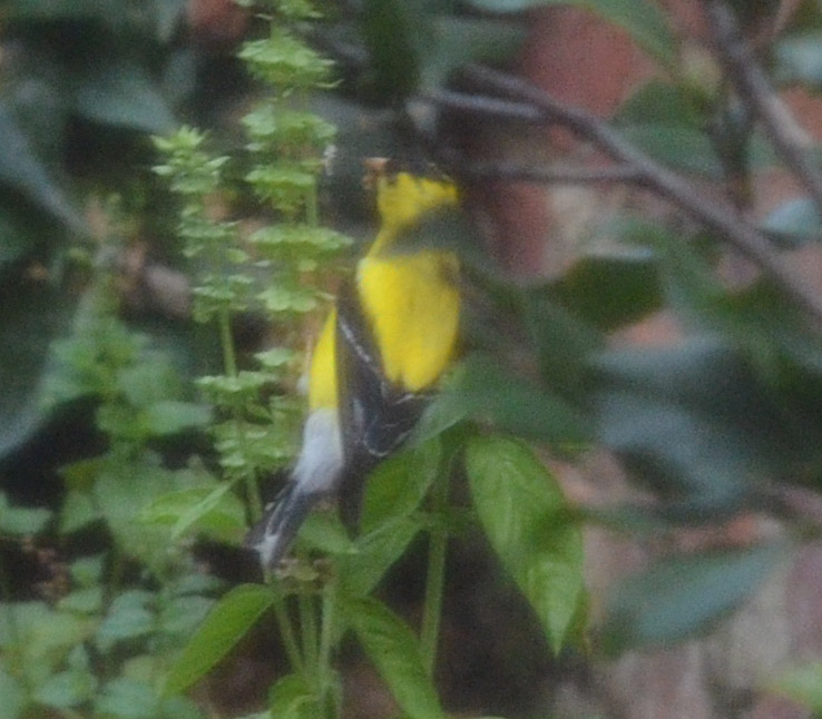 While GM was looking out his back window last night, he happened to notice a bright yellow bird munching on the flowers of his basil plant: