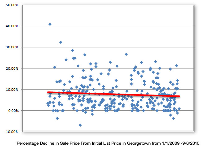 The more pressing question is how did sales prices fare compared with list prices. On that account 2010 was slightly better than 2009. The mean drop in price from list to sale for 2010 was $123,068.86, the median drop was $65,000. That compares with 2009’s numbers of $134,760.13 and $65,000 respectively. So the mean drop is down slightly and the median drop is exactly the same.